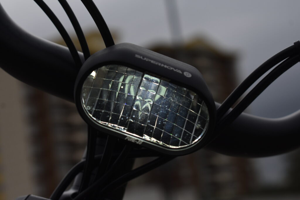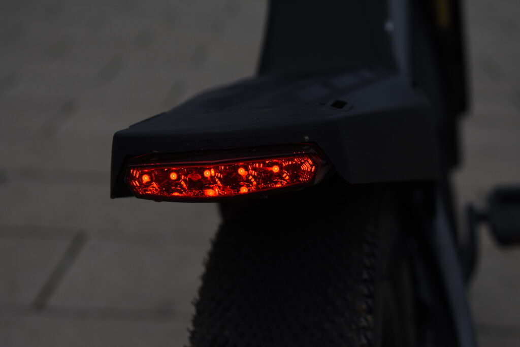 The hardwired front and rear lighting was superb and makes you highly visible as well as doing a good job of lighting up the road in front of you. The funky looking mudguards did a decent job in non-stop autumn drizzle and whilst they stopped most of the mud on a soggy but easy off-road ride, I still suffered a bit of mud spatter on my backpack, so a bit of extra length on them would have been a welcome addition.